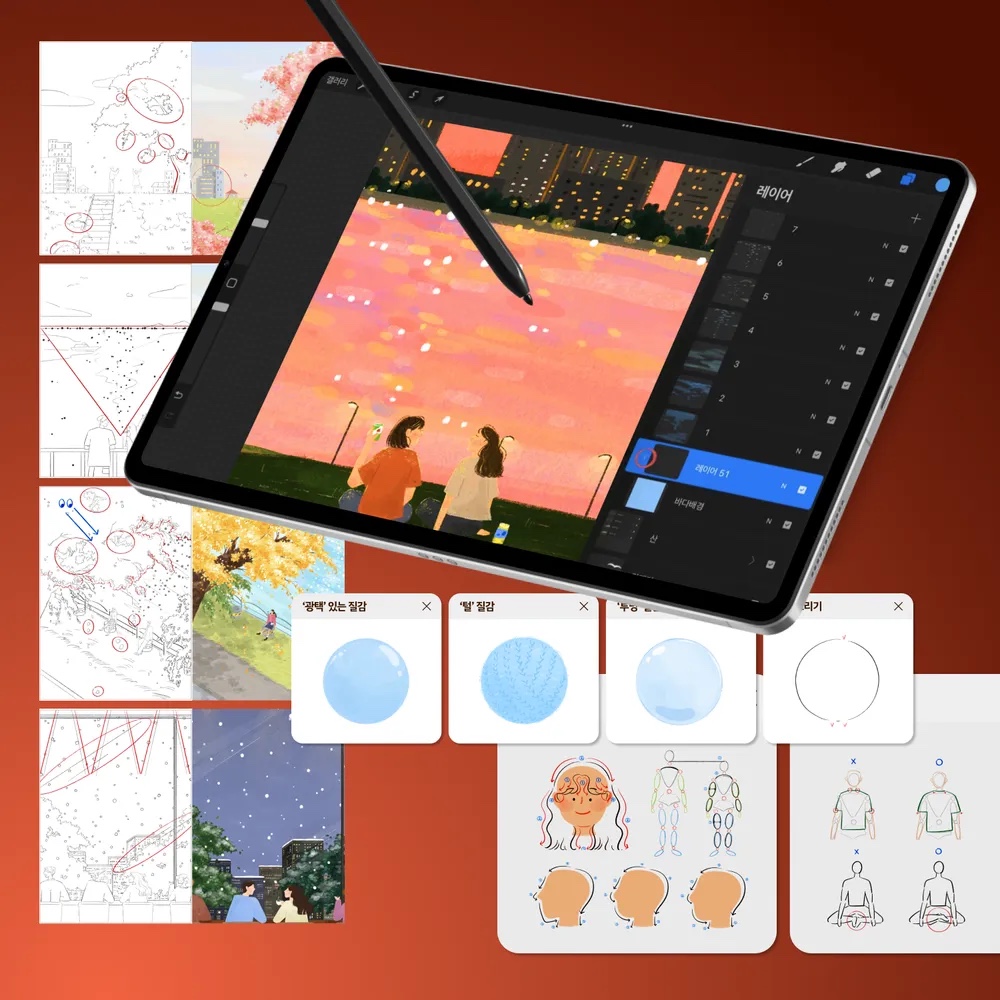 스케치부터 구도까지, 작가의 작업 과정과 그에 따른 팁을 하나씩 따라가며 살펴보실 수 있습니다.